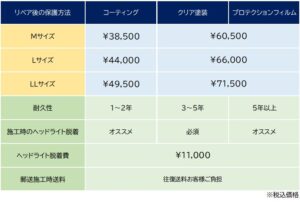 ヘッドライトの黄ばみ・クラックなどのリペアはお任せください。他者で断られたリペアもご相談ください。郵送施工にて日本全国対応。